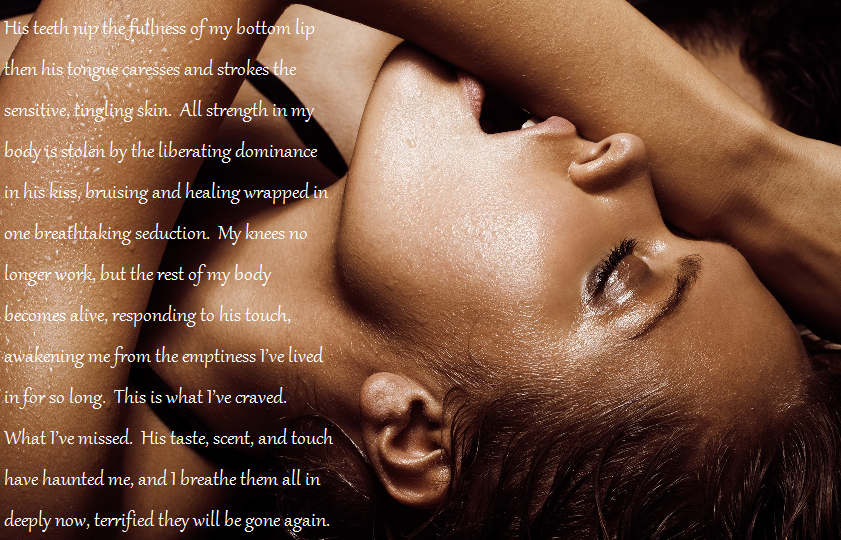 I take one step towards him and that’s all he needs to wrap me in his arms, pulling me against his chest to close the rest of the distance between us as his hungry mouth collides against mine. His teeth nip the fullness of my bottom lip then his tongue caresses and strokes the sensitive, tingling skin. All strength in my body is stolen by the liberating dominance in his kiss, bruising and healing wrapped in one breathtaking seduction. My knees no longer work, but the rest of my body becomes alive, responding to his touch, awakening me from the emptiness I’ve lived in for so long. This is what I’ve craved. What I’ve missed. His taste, scent, and touch have haunted me, and I breathe them all in deeply now, terrified they will be gone again.